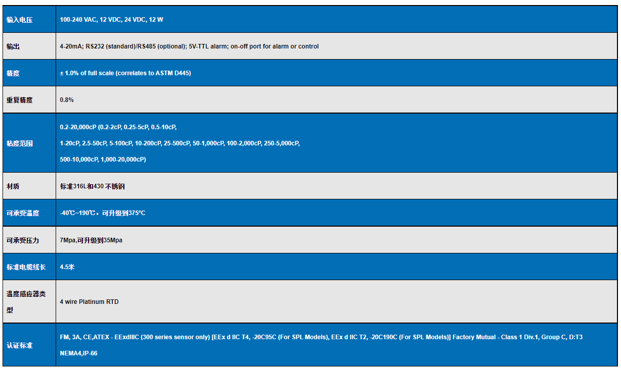 VISCOpro2000 在線粘度計(jì)規(guī)格參數(shù):